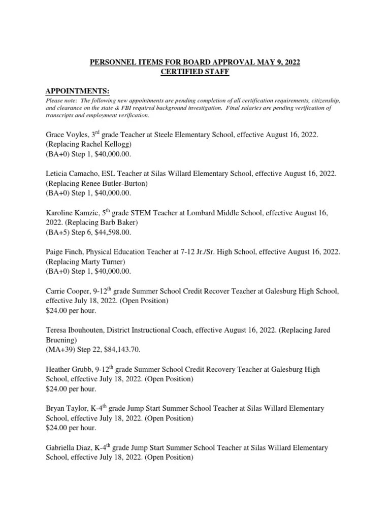 Galesburg School District 205 May 2022 Personnel Agenda PDF Middle