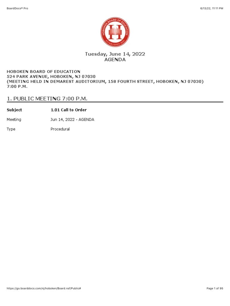 Hoboken Board of Education Tuesday, June 14, 2022 AGENDA PDF