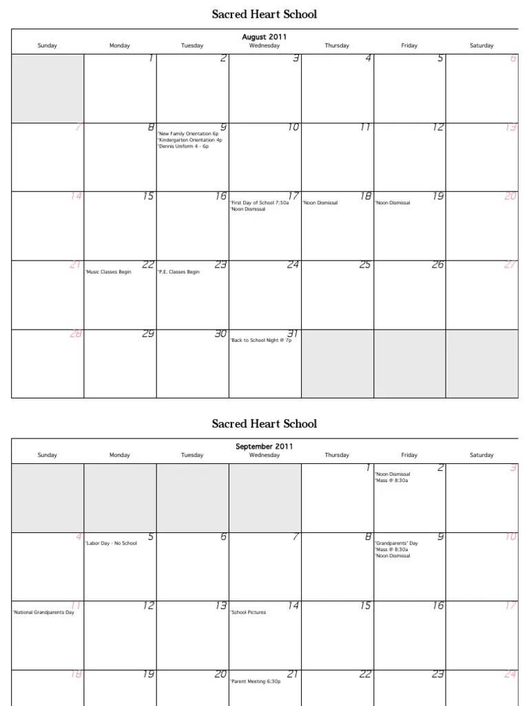 Sacred Heart School Calendar 20112012 PDF Academic Term Observances