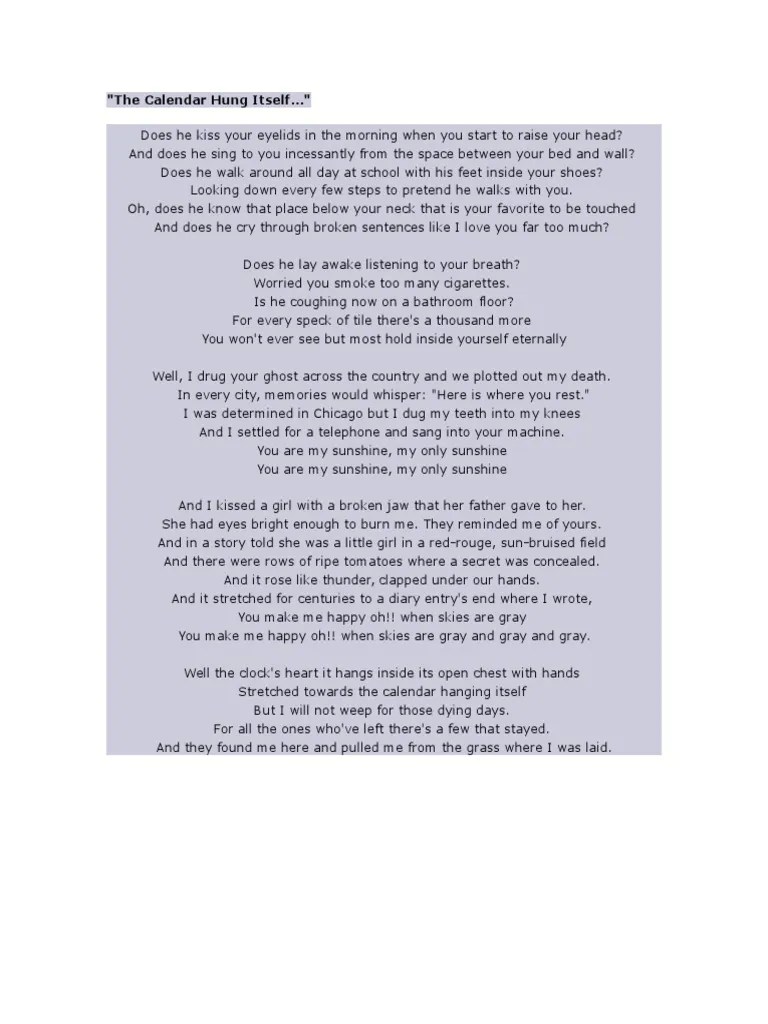 Web the calendar hung itself. Web the calendar hung itself lyrics. Does he kiss your eyelids in the morning when you start to raise your head? Does he kiss your eyelids in the morning when you start to raise your. And does he sing to you incessantly from.